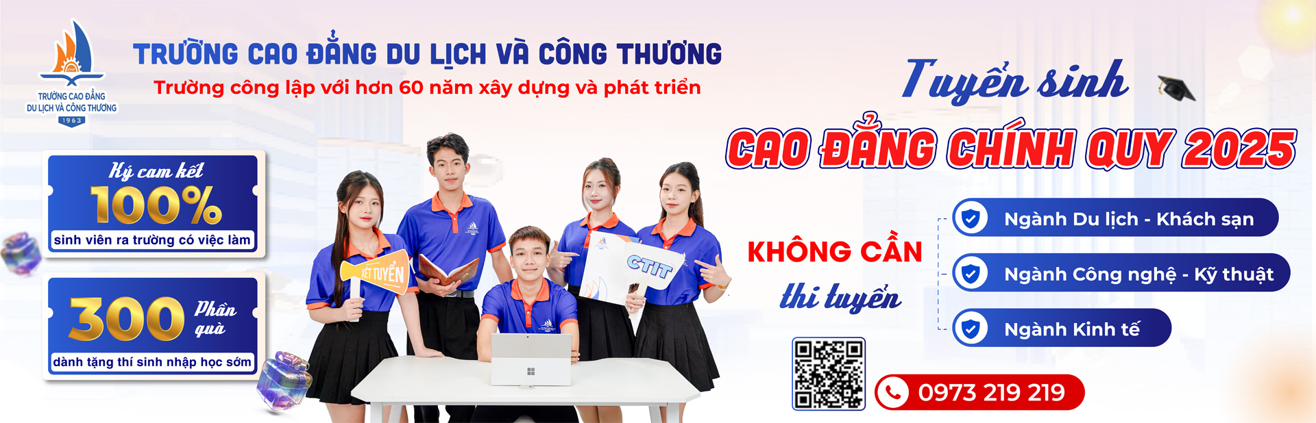 Trong năm 2024 Trường Cao đẳng Du lịch và Công thương tuyển sinh, đào tạo các lớp Cao đẳng chính quy, Trung cấp liên thông lên Cao đẳng Chính quy và các lớp sơ cấp, có Cam kết Bố trí Việc làm cho Sinh viên sau khi ra trường
